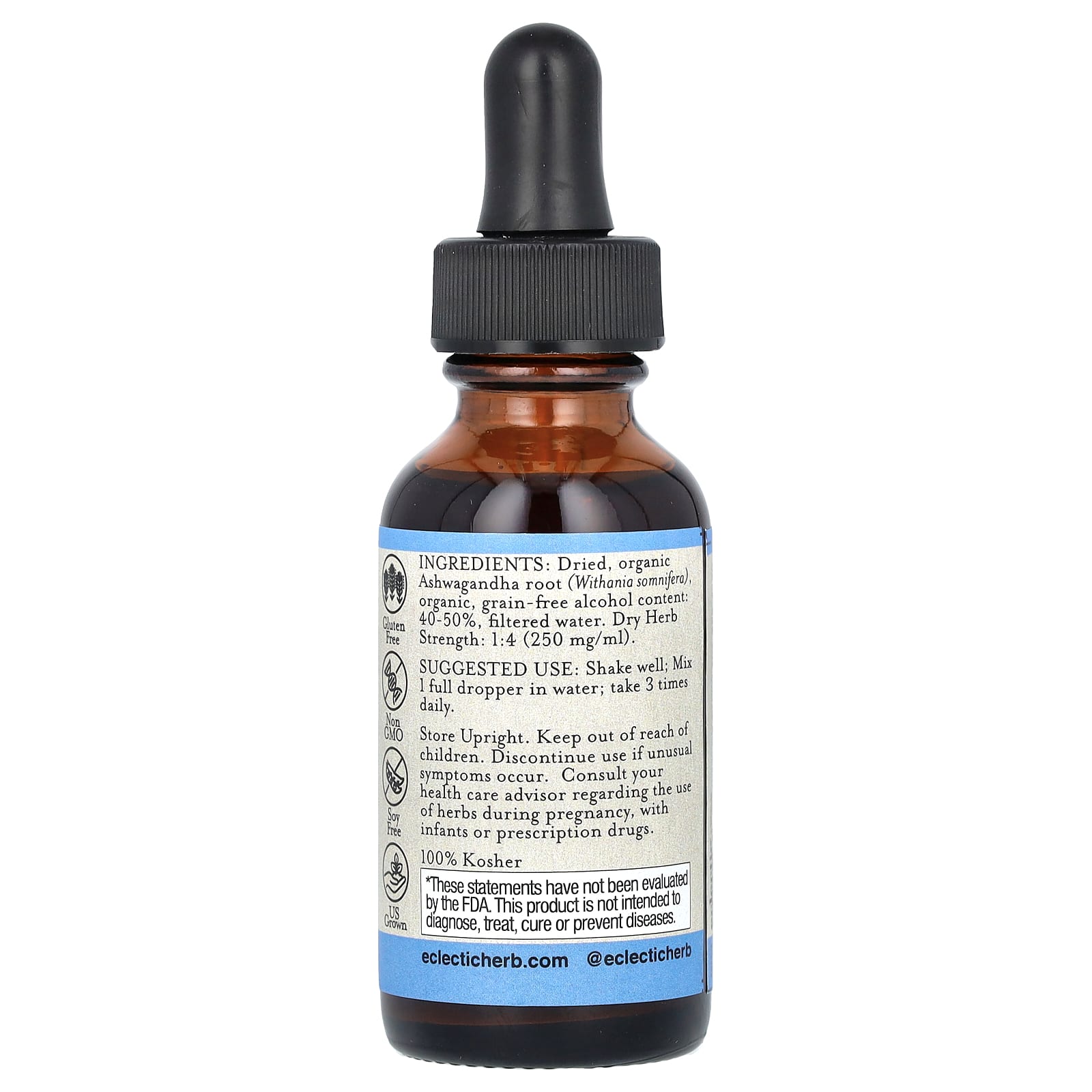 Certified organic ashwagandha harvested at peak potency and organic grain-free alcohol.