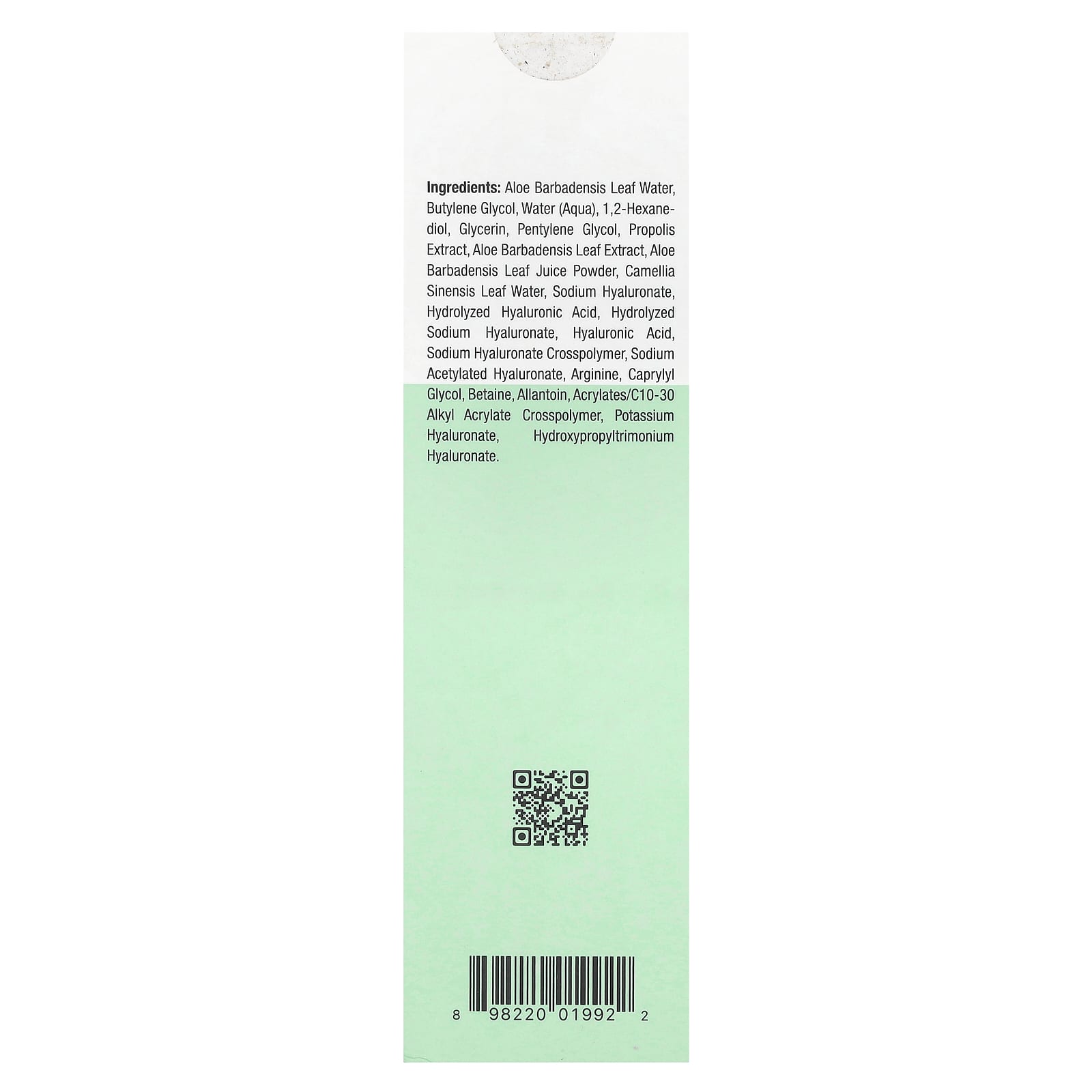 Aloe Barbadensis Leaf Water, Butylene Glycol, Water (Aqua), 1,2-Hexanediol, Glycerin, Pentylene Glycol, Propolis Extract, Aloe Barbadensis Leaf Extract, Aloe Barbadensis Leaf Juice Powder, Camellia Sinensis Leaf Water, Sodium Hyaluronate, Hydrolyzed Hyaluronic Acid, Hydrolyzed Sodium Hyaluronate, Hyaluronic Acid, Sodium Hyaluronate Crosspolymer, Sodium Acetylated Hyaluronate, Arginine, Caprylyl Glycol, Betaine, Allantoin, Acrylates/C10-30 Alkyl Acrylate Crosspolymer, Potassium Hyaluronate, Hydroxypropyltrimonium Hyaluronate.