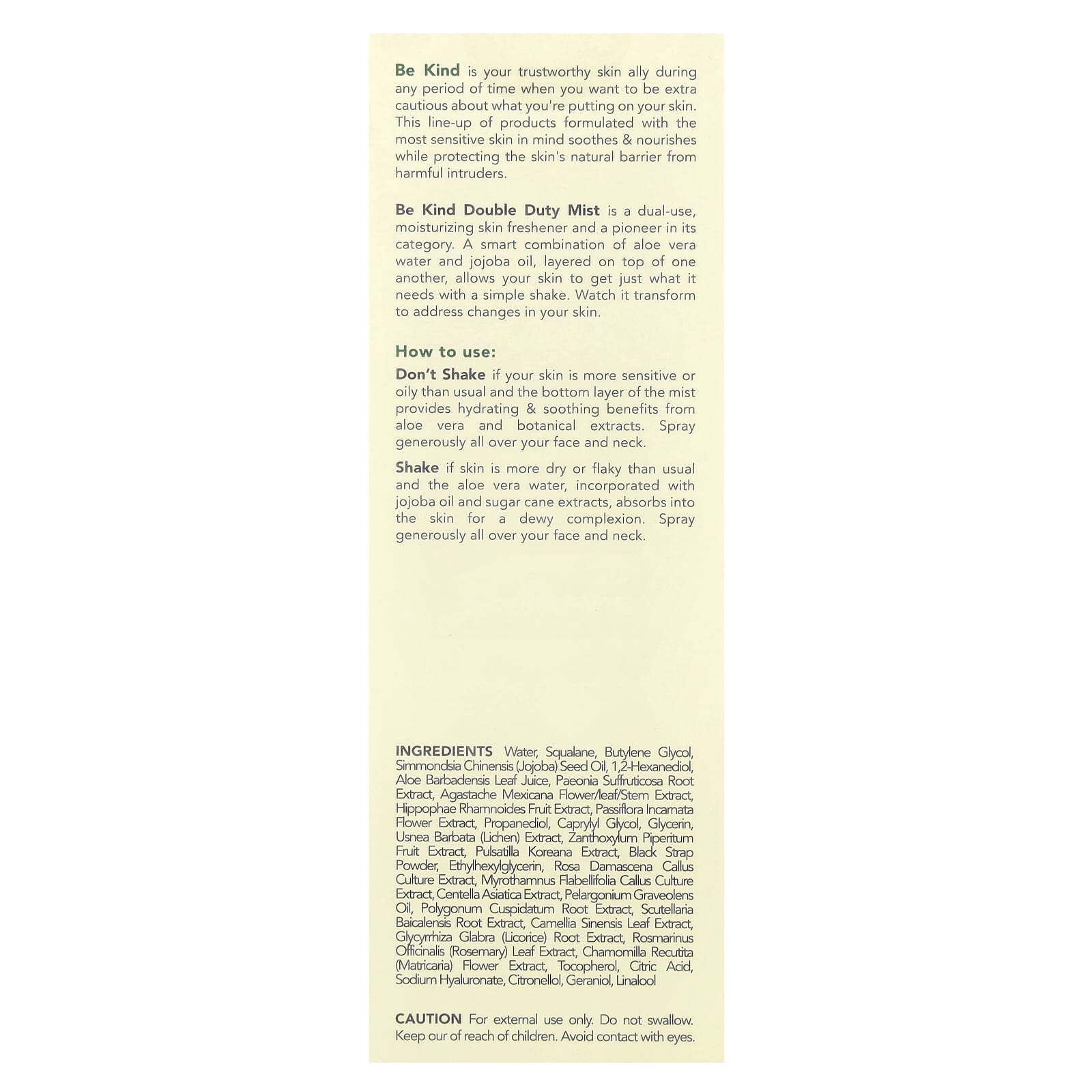 Be Kind Double Duty Mist is a dual-use, moisturizing skin freshener and a pioneer in its category. A smart combination of aloe vera water and jojoba oil, layered on top of one another, allows your skin to get just what it needs with a simple shake. Watch it transform to address changes in your skin.
