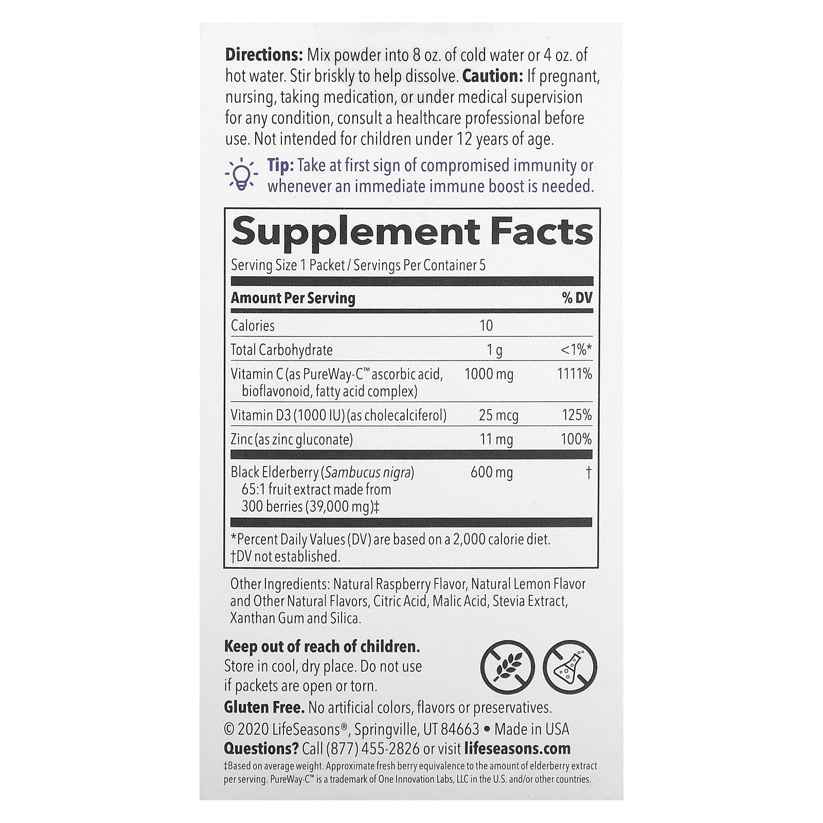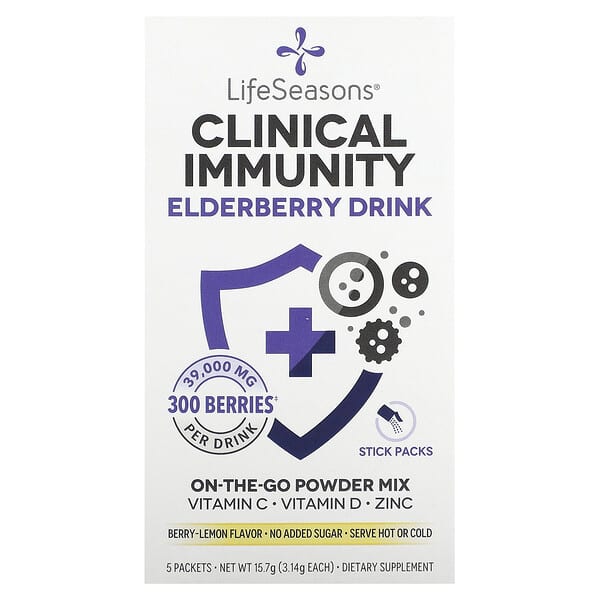 LifeSeasons, Clinical Immunity Elderberry Drink Mix, Berry-Lemon, 39,000 mg, 5 Packets, 3.14 g Each
