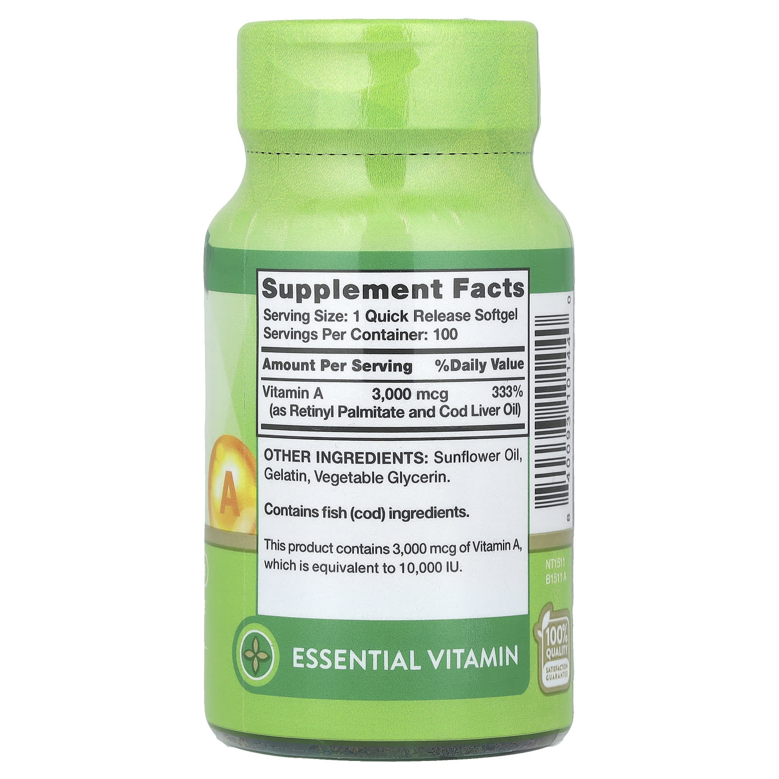 Each serving of Nature’s Truth Vitamin A softgels delivers 10,000 IU (3,000 mcg) of this fundamental vitamin from Retinyl Palmitate and Cod Liver Oil. One quick release softgel per day is all you need to meet the recommended daily value of this essential vitamin.
