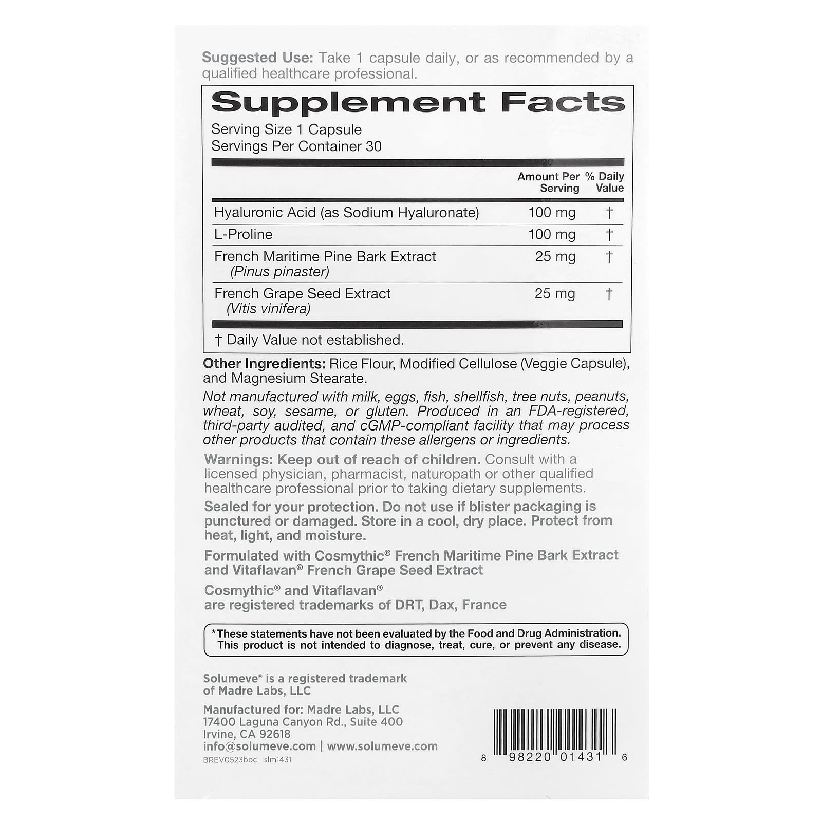 Hyaluronic Acid (as Sodium Hyaluronate), L-Proline, French Maritime Pine Bark Extract (Pinus pinaster), French Grape Seed Extract (Vitis vinifera)